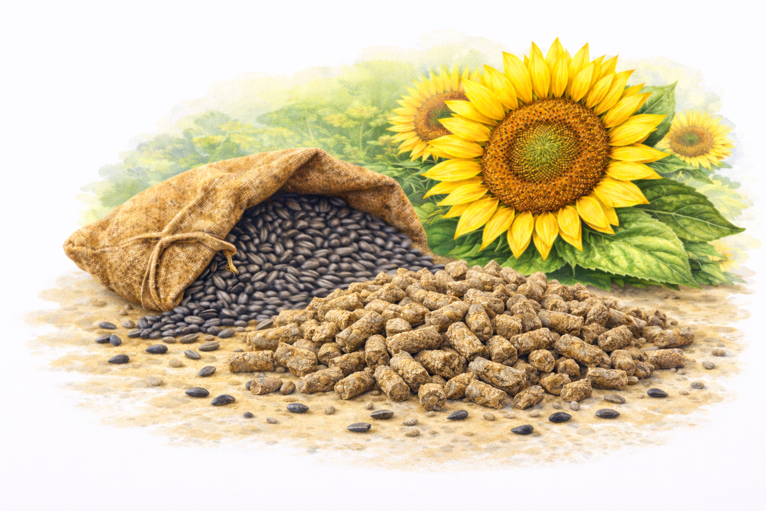Высокобелковый кормовой продукт, получаемый в результате экстракции масла из семян подсолнечника.